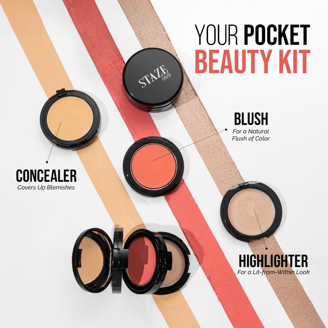 STAZE Glow 3-in-1 Pocket Beauty Kit | Concealer + Blush + Highlighter | Buildable, Blendable, 12-Hour Wear